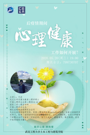 (通讯员梁春晴)在充满爱的520之夜,mk网页版登录入口邀请学校大学生心理健康中心艾波老师在“腾讯会议”平台举办“后疫情期间如何开展学生心理健康工作”的讲座。讲座由学院党委副书记成轶主持,全院辅导员、班主任和本科生导师齐聚云端,共同探讨如何用老师们的爱,温暖学生的心灵,做好学生日常管理和教育教学工作。