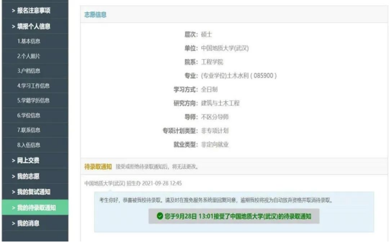 通过大学前三年的学习我发现自己具有较强烈的学习意愿,加上对本专业的知识也有兴趣,所以打算继续读研。2021年6月从南京回到武汉后,我在各个渠道上了解到很多的学校开始了暑期夏令营活动,根据自己的意愿和各大院校的要求,我报名参加了中国地质大学的夏令营活动,顺利地通过了笔试和面试。在9月,通过长时间的准备我获得了学院的推免生资格,随后在填报志愿后收到了中国地质大学的待录取通知。 从我自己的学习经历上来说,我觉得学习上一定要找到适合自己的学习方法,有规律有计划。还有就是对待事情不要犹犹豫豫,想做就去做。而且开始了就别停下,不要后悔,因为一开始就奔着月亮去,就算失败,也许能收获一颗星星呢。认真面对每一次挑战,在不断收获“星星”的过程中我们会渐渐地接近那个胜利的终点。