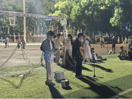 歌曲串烧环节,校园歌手用清澈嗓音演绎经典,熟悉旋律引发全场轻声跟唱,新生们打开手机闪光灯,点点“星光”在夜色中摇曳,画面温馨动人,更有校园乐队为音乐节添彩。