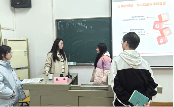 张平老师首先深入剖析了当前央国企的就业形势与政策背景,系统梳理了央国企的分类体系、最新名录及发展特点,并结合实际案例解析其人才需求趋势与职业发展优势,引导学生立足宏观环境,科学评估自身条件,打破信息壁垒,实现职业规划的精准定位。针对央国企招聘环节多、周期长的特点,张平老师重点拆解了从网申、笔试到面试的完整求职链条。她详细讲解了如何高效梳理关键时间节点、打造与岗位高度匹配的专业简历,并分享了笔试常考题型、面试常见问题及应对策略,帮助学生构建清晰的备考路线图与应聘行动计划。最后,在交流环节,同学们围绕“职业发展通道”“实习经历挖掘”等实际问题踊跃提问。张平老师结合自身丰富的行业经验与案例,给予了细致解答和具体建议,为学子们提供了切实可行的行动参考。