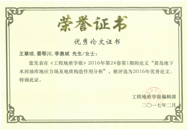 2017年2月23日,《工程地质学报》编辑部公布了该期刊2016年度优秀论文评选结果,我校资土学院青年教师王章琼以第一作者身份发表的论文《黄岛地下水封油库地应力场及地质构造作用分析》成功入选。