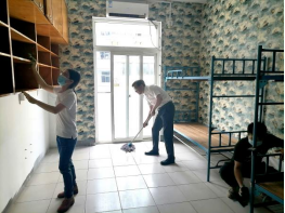 擦窗户、摆桌椅,拖地板·····,清扫过程中,全体师生党员纷纷当先锋、做表率,自带清洁工具,大家不怕脏,不怕累,撸起袖子仔细认真地清扫着新生宿舍的每一处角落。当发现宿舍门窗破损、线路故障等问题时,及时上报维修,尽心尽力为新生提供一个良好的住宿环境。经过师生党员的共同努力,全体新生宿舍面貌焕然一新。