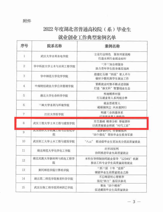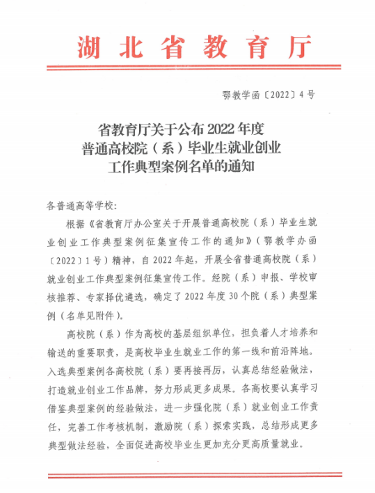 本次活动由湖北省教育厅组织开展,共评选出典型案例30个,旨在深入挖掘宣传湖北省高校院(系)毕业生就业创业工作的典型经验做法,选树一批可学习、可借鉴、可推广的优秀案例和工作品牌,有力的促进全省高校毕业生更加充分和更高质量就业。